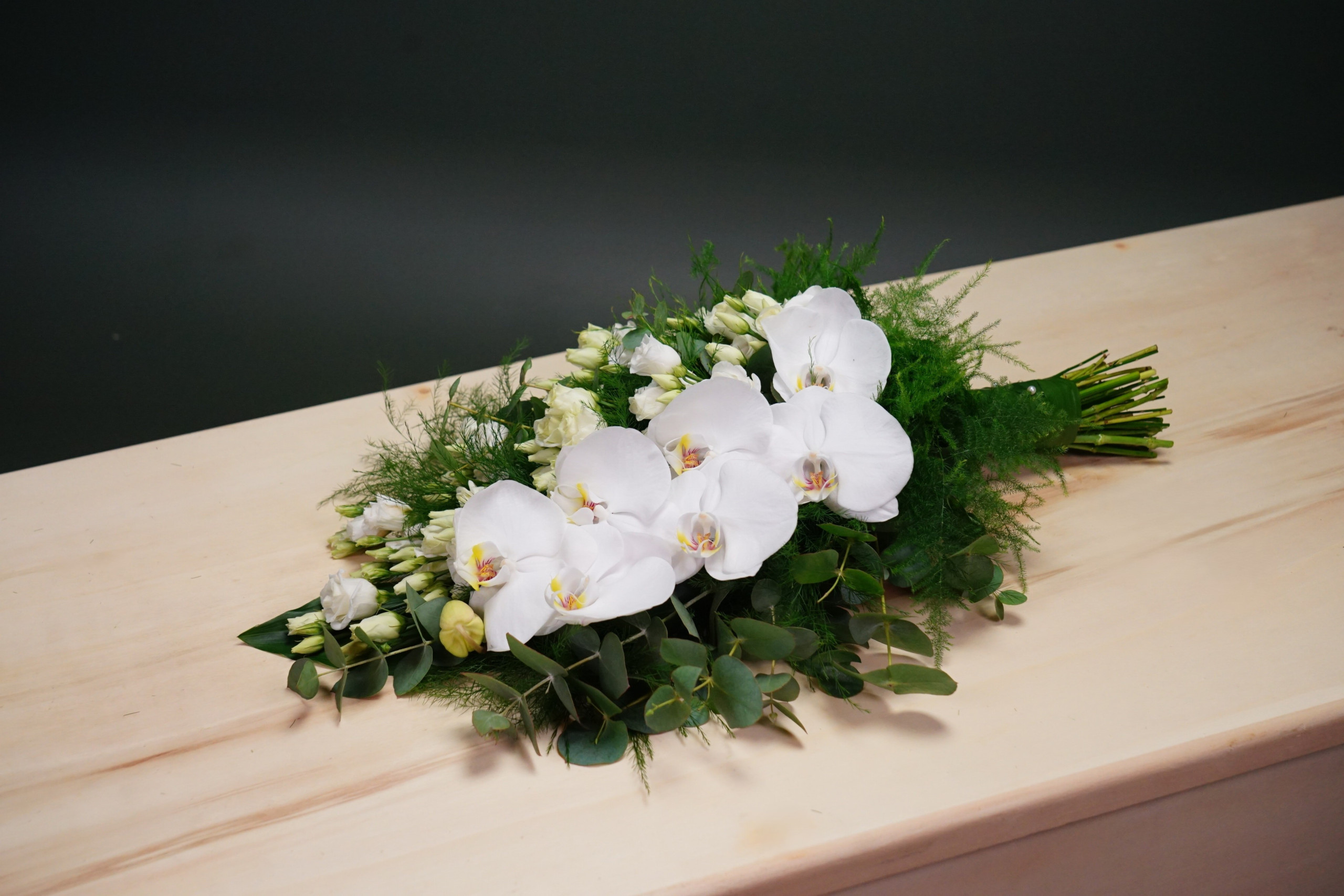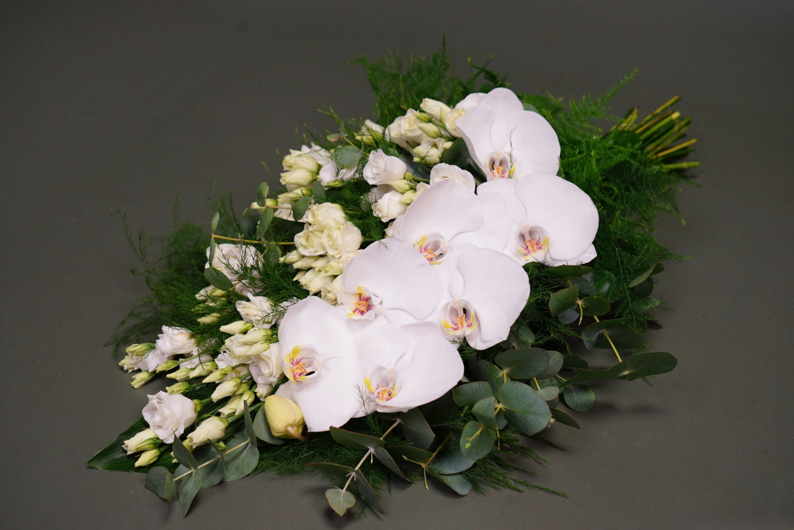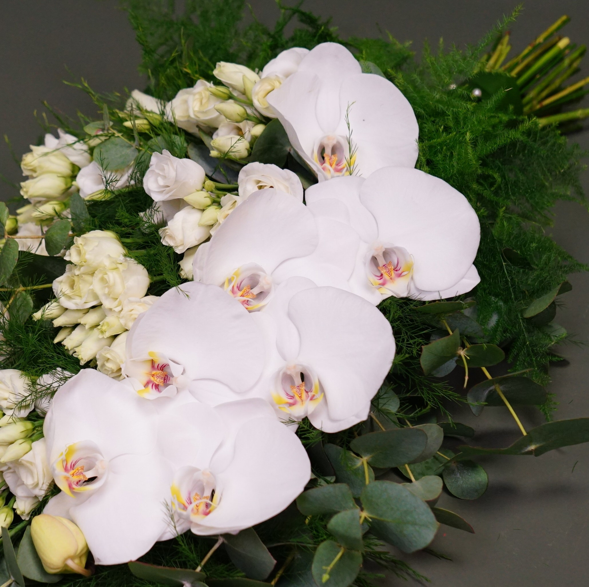 Rouwboeket uit witte phalaenopsis-bloemen en witte lisianthussen, beschikbaar & bestelbaar het gehele jaar.