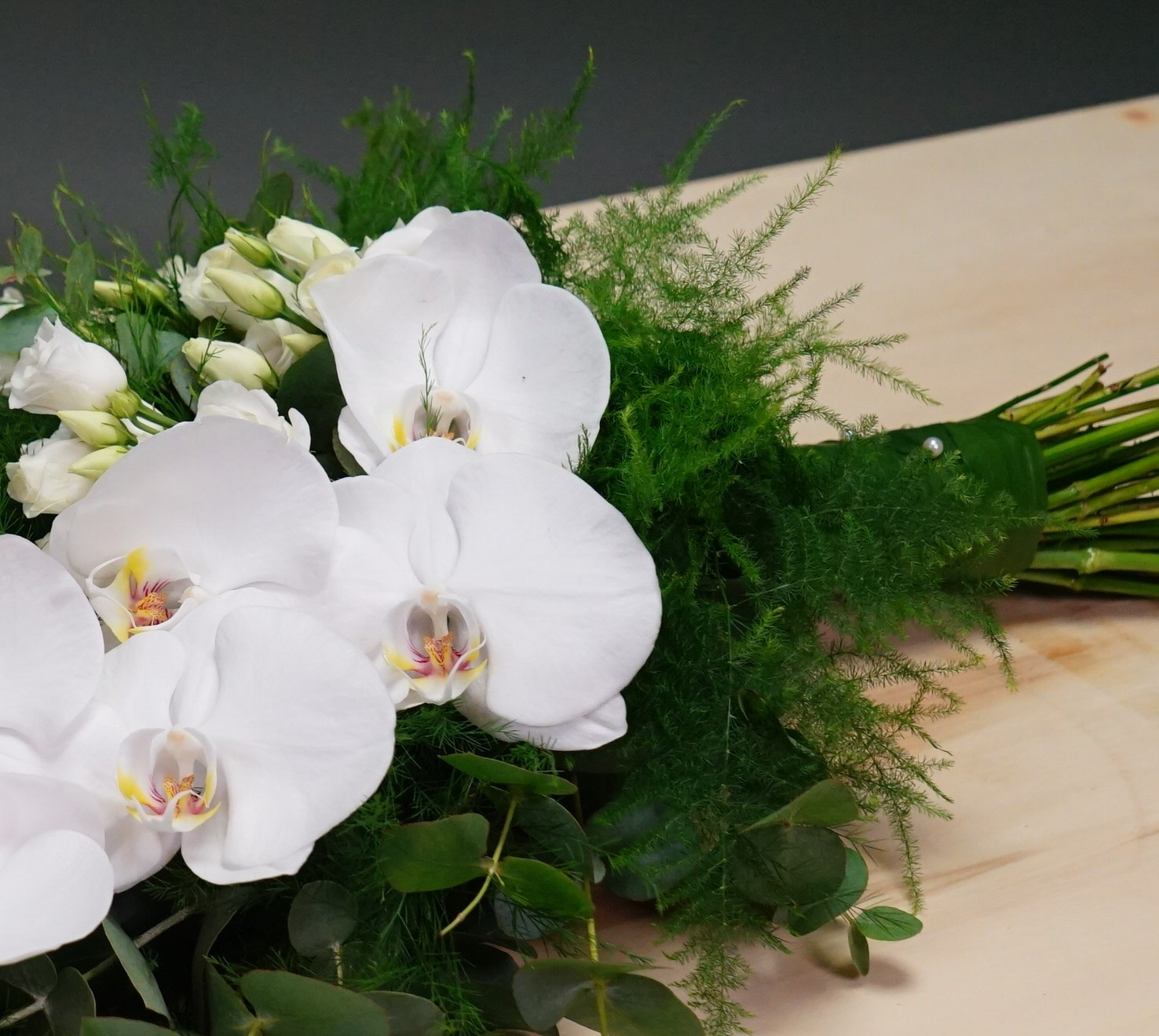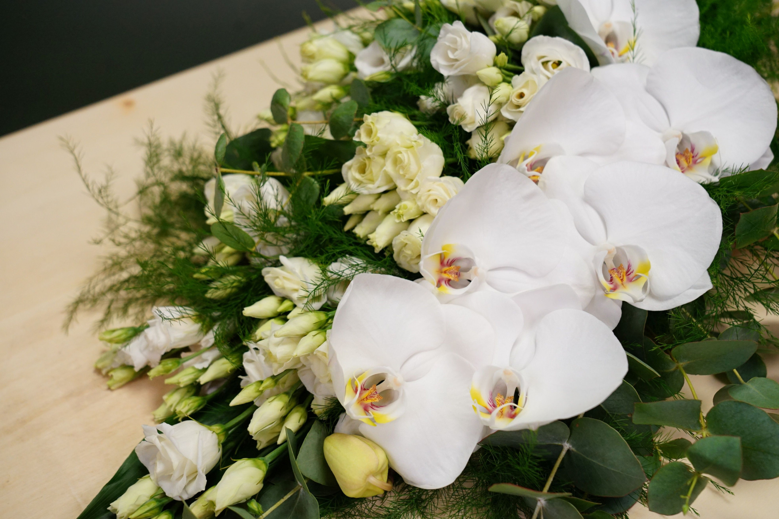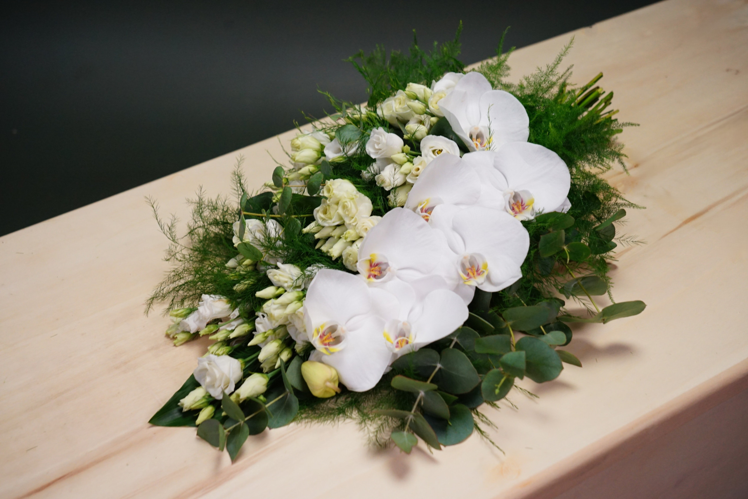 Rouwboeket uit witte phalaenopsis-bloemen en witte lisianthussen, beschikbaar & bestelbaar het gehele jaar.