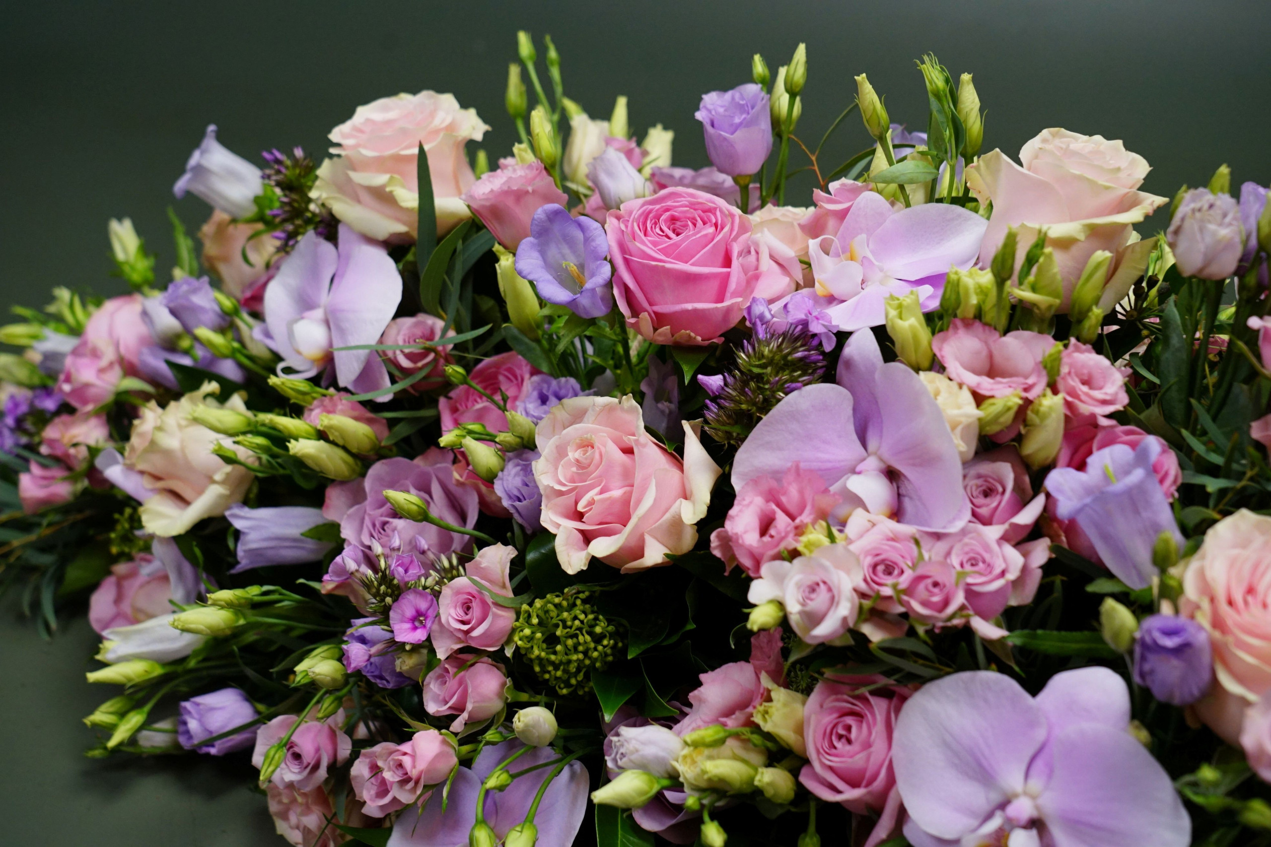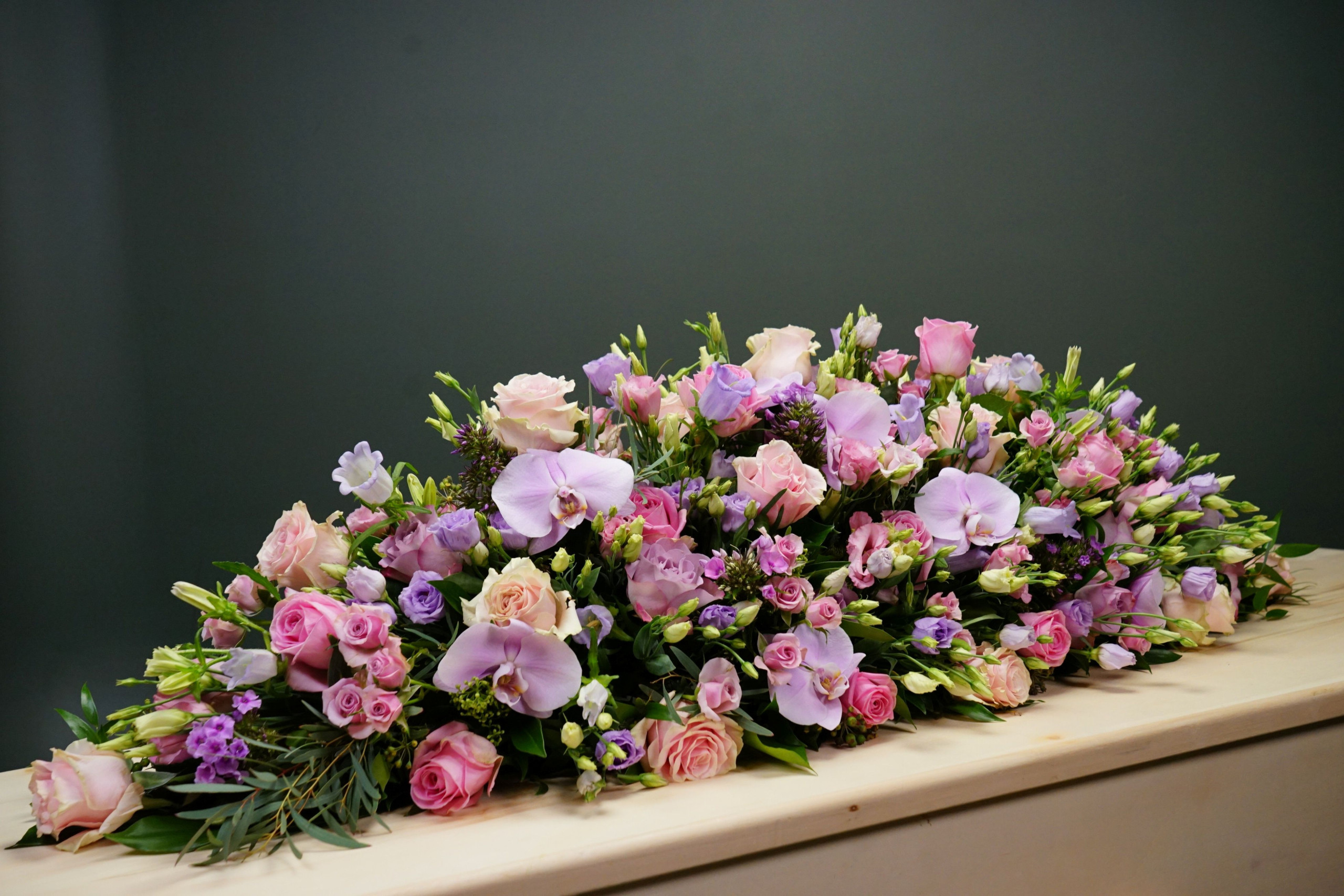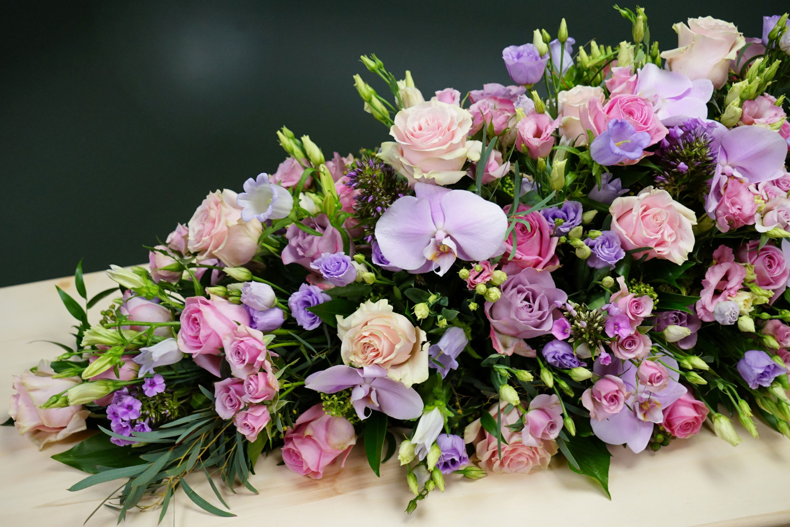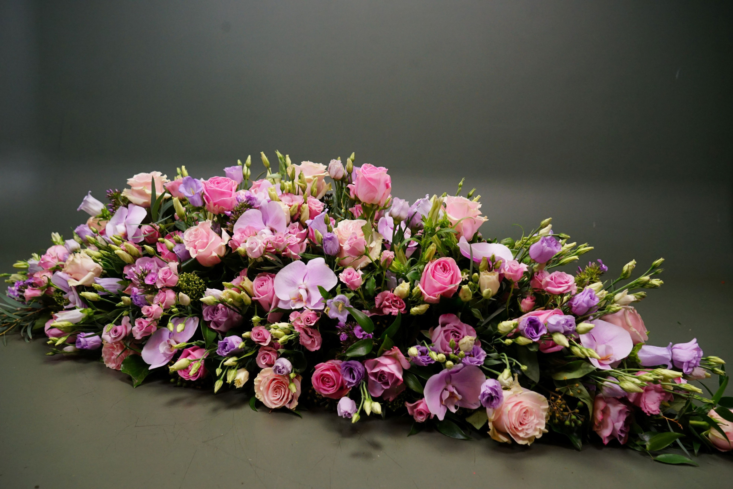 Ziet u de rijkdom aan bloemen in dit arrangement? Zijn de roze+lila tinten juist voor u in deze bijzondere situatie zo vanzelfsprekend?